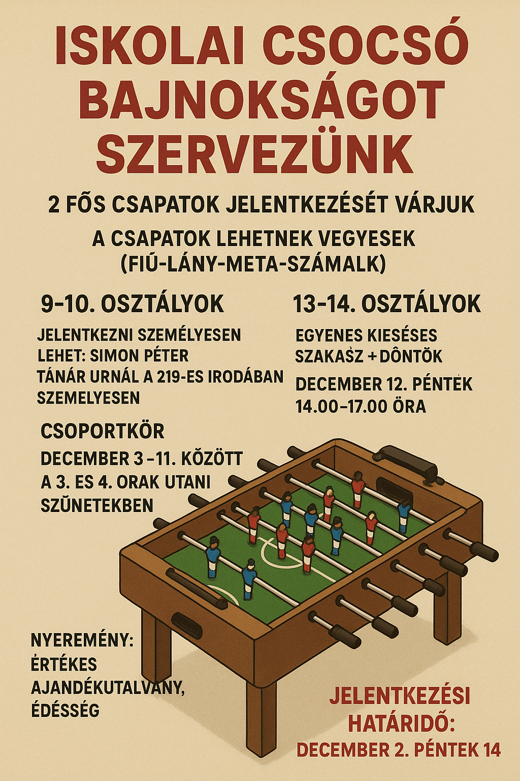 Iskolai csocsó bajnokságot szervezünk az adventi időszakban.