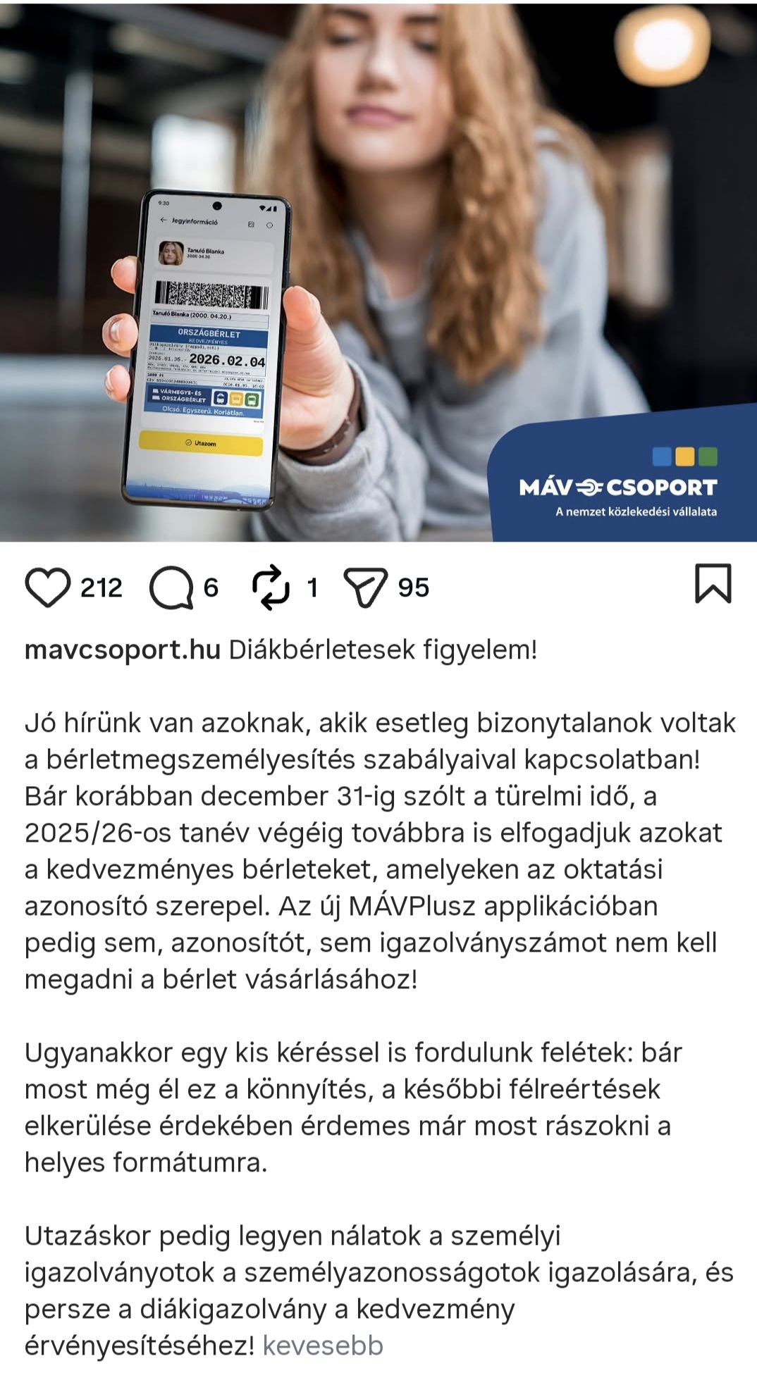 Diákbérletesek figyelem! - MÁV csoport oldalán található bejegyzés